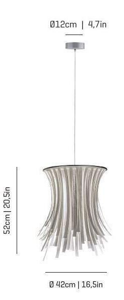 Die Arturo Alvarez Bety Eco BECO04 verfügt über einen Leuchtenschirm mit einer Höhe von 52 cm. Der Schirmdurchmesser beträgt 42 cm. Der Leuchtenschirm ist in den Oberflächen weiß, grau, grün, rot, braun, goldgelb, beige, blau oder medium braun erhältlich. Das Licht wird von dieser Pendelleuchte direkt nach unten und auch durch den Leuchtenschirm zur Seite abgegeben. Die Bety Eco BECO04 wird standardmäßig mit einem transparenten Kabel geliefert. Auf Anfrage wird sie auch mit einem schwarzen Kabel angeboten. Die Leuchte hat eine maximale Gesamthöhe von 150 cm, ihr Kabel ist bei Bedarf kürzbar. Die Pendelleuchte gibt es als E27- oder LED Version. Die E27-Version hat eine E27 Fassung und wird mit einer austauschbaren LED Retrofit betrieben. Die LED Version hat eine integrierte LED mit einer Farbtemperatur von 2.700 Kelvin extra warmweiß. Auf Anfrage ist die LED Version auch mit 3.000 Kelvin warmweiß und DALI dimmbar erhältlich.