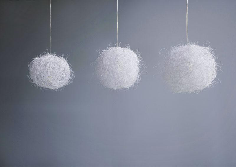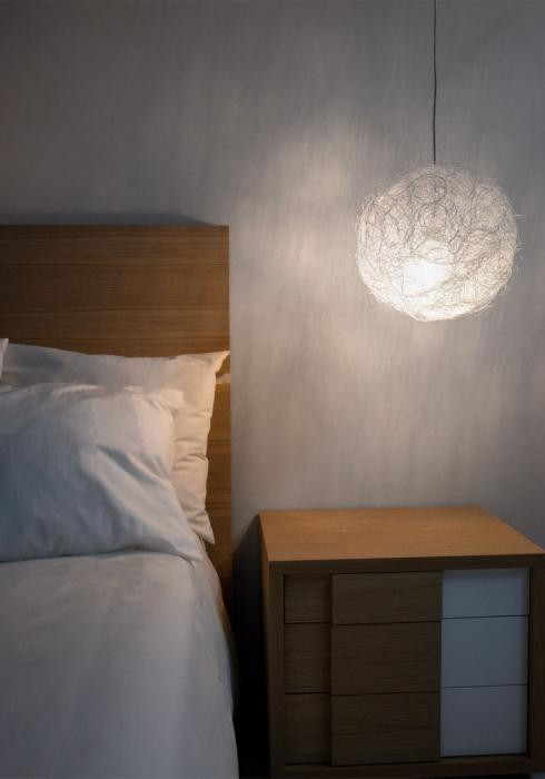 Die Pili PL04-Mini von Arturo Alvarez ist eine Pendelleuchte, die aus einem weiß lackierten Edelstahlfaden besteht. Dieser Edelstahlfaden ist verwoben und erzeugt zufällige Formen und Volumen. Das Kabel dieser weißen Pendelleuchte kann bei Bedarf gekürzt werden, die Gesamthöhe der Leuchte beträgt maximal 150 cm. Die Pili PL04-Mini verfügt über einen Durchmesser von 30 cm. Diese Leuchte hat eine E27 Fassung und kann mit LED-Retrofit Leuchtmitteln betrieben werden.