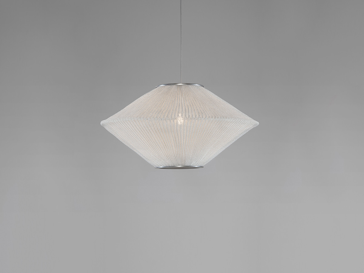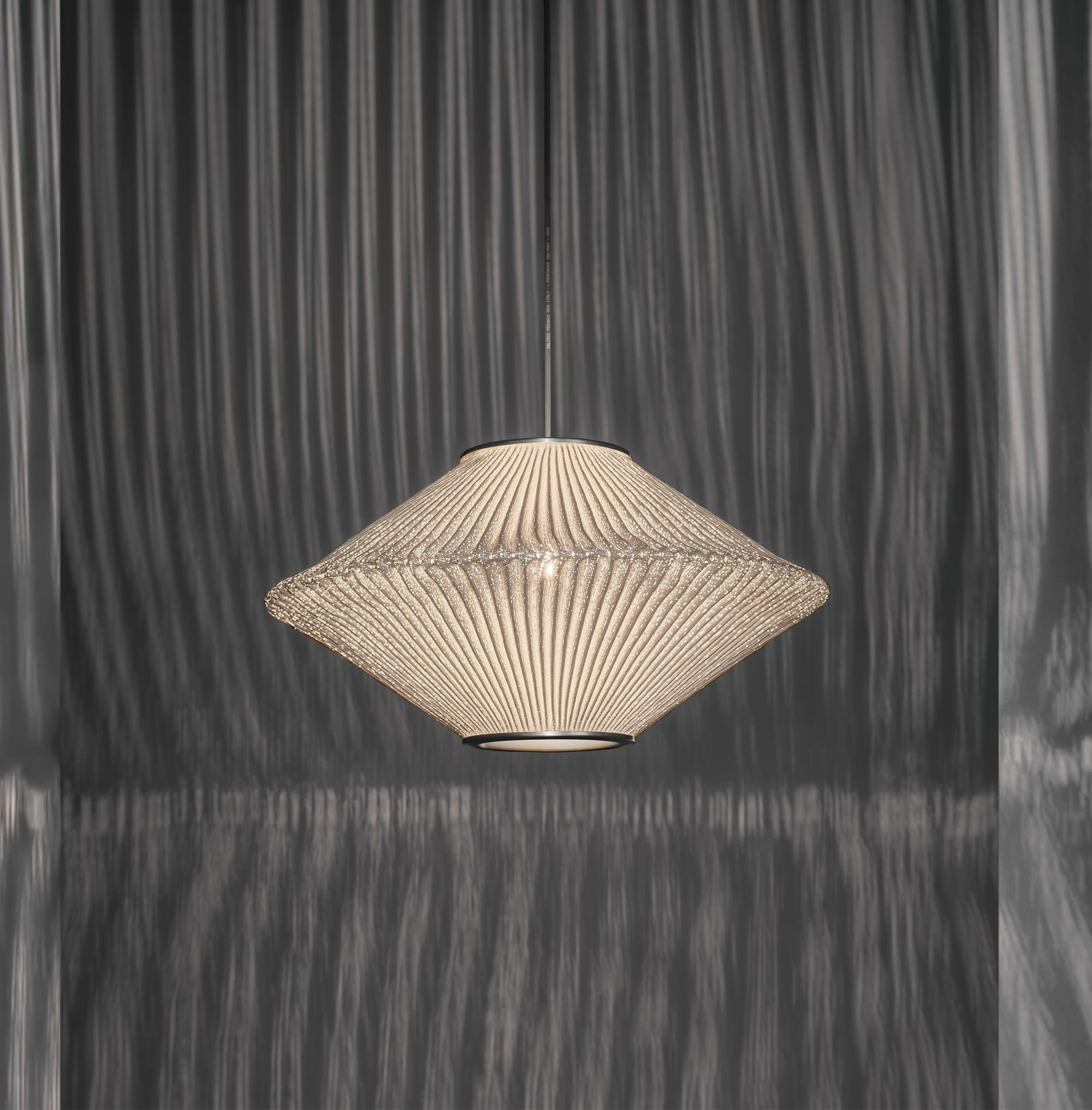 Die Pendelleuchte Ura1 UR104 zeichnet sich durch den Einsatz des extrem flexiblen Materials aus. Dieses Edelstahl-Metallgeflecht wurde exklusiv von der Marke Arturo Alvarez entwickelt und erlaubt dem Designer eine enorme kreative Freiheit. Die Pendelleuchte Ura1 UR104 wird in den Oberflächen weiß und grau angeboten. Auf Anfrage ist die Leuchte auch in taupe und beige erhältlich. Sie hat ein transparentes Kabel, auf Anfrage ist sie auch mit einem schwarzen Kabel erhältlich. Das Kabel dieser Pendelleuchte, die eine Gesamthöhe von 150 cm besitzt, kann bei Bedarf gekürzt werden. Die Ura1 UR104 hat einen Durchmesser von 50 cm und eine Höhe von 26 cm. Diese bauseitig dimmbare Pendelleuchte wird von einem Leuchtmittel mit E27 Fassung betrieben. Diese Leuchte kann mit LED-Retrofit Leuchtmitteln betrieben werden. Neben dieser E27-Leuchte ist auch eine Version der Pendelleuchte mit integrierter LED erhältlich.