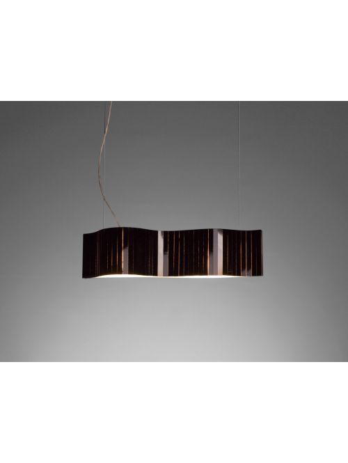Die Vento VN04-LD des spanischen Designers Arturo Alvarez ist eine LED Pendelleuchte mit einem geschwungenen Schirm aus Tiffanyglas. Der Schirm dieser Leuchte wird in sorgfältiger Handarbeit hergestellt und in mehreren verschiedenen Versionen angeboten. Diese Pendelleuchte ist in den Oberflächen weiß, braun, sand, beige-braun oder bernstein erhältlich. Bei der Version beige-braun ist ein Teil des Schirms beige und der andere braun. Die Pendelleuchte ist 96 cm lang, 19 cm tief und 17 cm hoch. Diese Pendelleuchte ist bauseitig dimmbar (via Phasenabschnittdimmer) und hat eine Farbtemperatur von 2.700 Kelvin extra warmweiß. Auf Anfrage gibt es auch eine DALI dimmbare Version. Zudem wird die Leuchte auf Anfrage mit einer Farbtemperatur von 3.000 Kelvin warmweiß angeboten. Auf Wunsch ist diese Leuchte auch mit schwarzen statt mit transparenten Kabeln erhältlich.