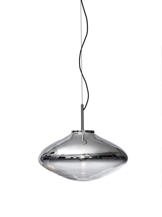Die Bomma Disc Pendant Metal ist eine Pendelleuchte mit einem mundgeblasenem Glas, das zur Hälfte mit silbernem Metall überzogen ist. Der untere, klare Teil des Glases gibt das Licht gleichmäßig nach unten und in den Raum ab. Durch den Metallüberzug auf dem oberen Teil entstehen zahlreiche Lichtreflexionen auf dem Glas. Jedes Glas wird bei der Herstellung einzeln mit Metall überzogen, so dass Intensität und Farbe der Metallbeschichtung variieren können.