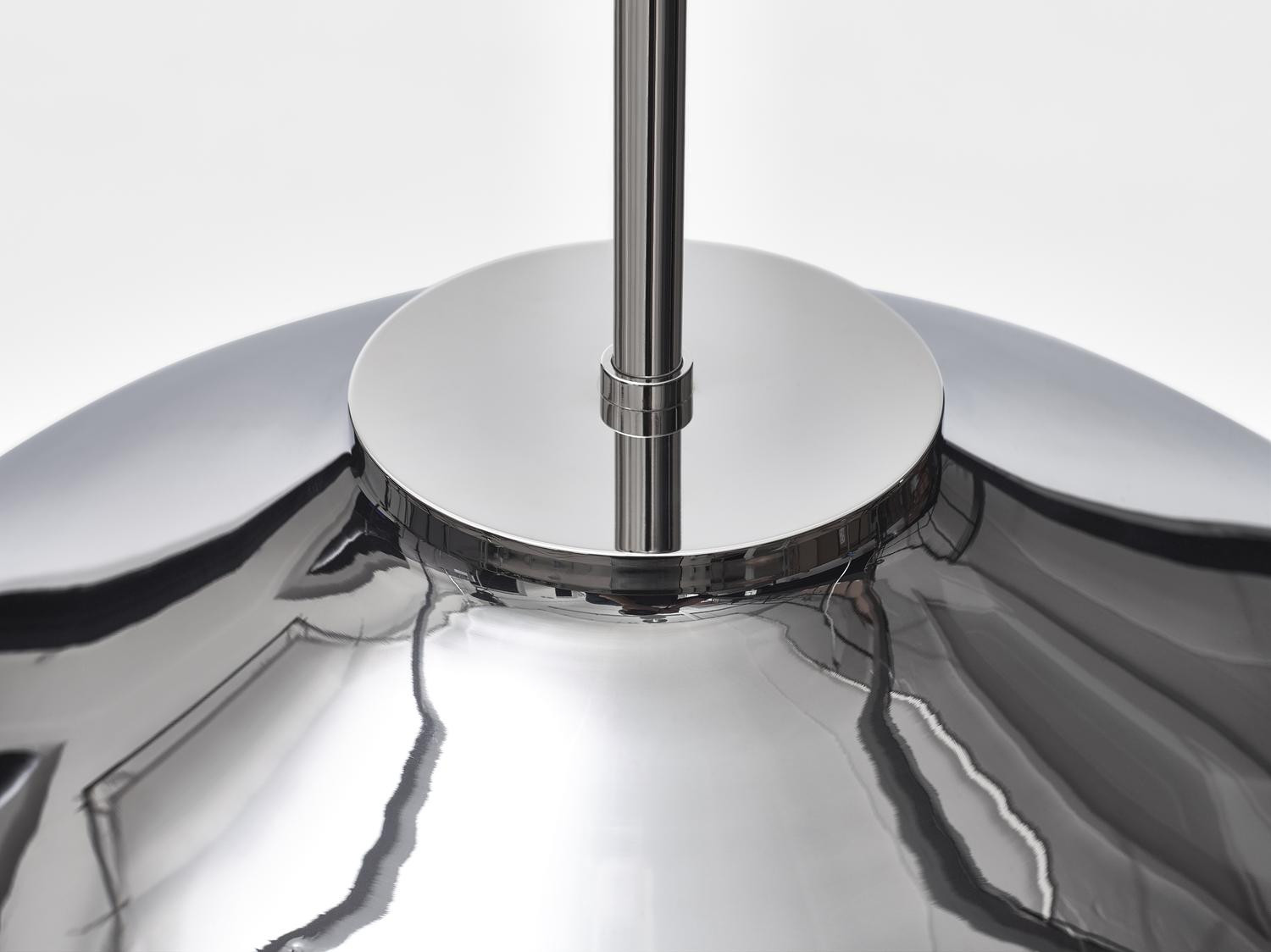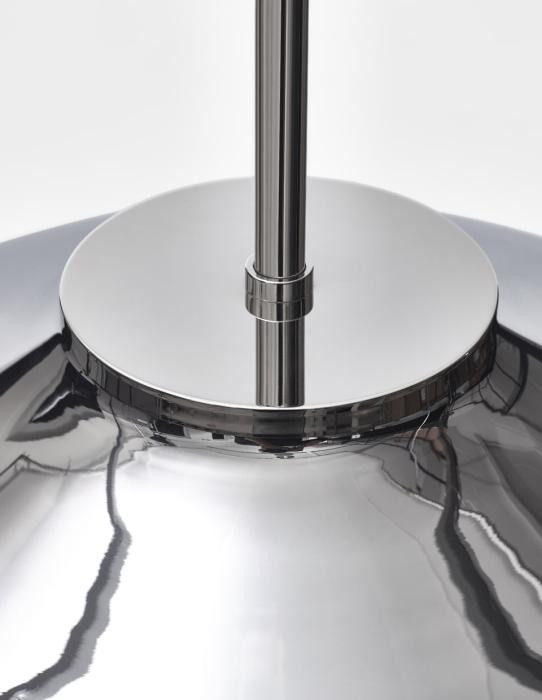 Die Bomma Disc Pendelleuchte Metall hat ein mundgeblasenes Glas mit einem Metallüberzug. Durch den Metallüberzug entstehen zahlreiche Lichtreflexionen auf der Leuchte.