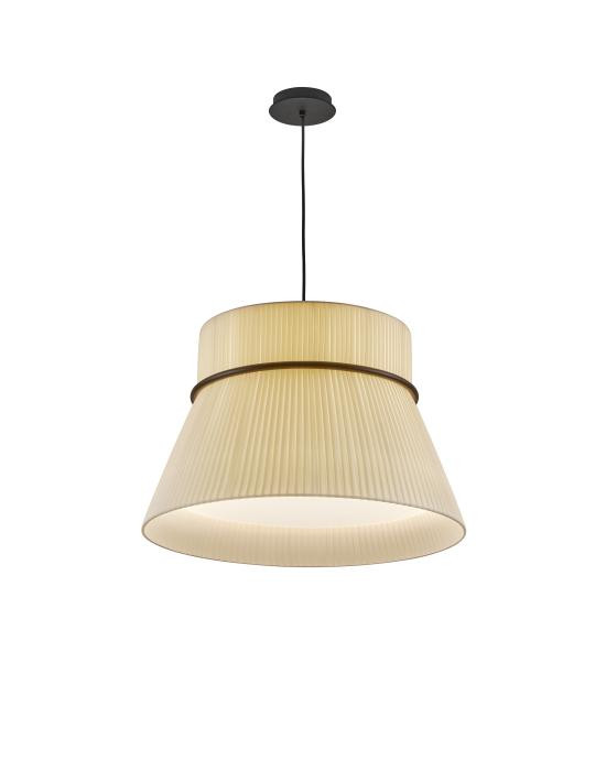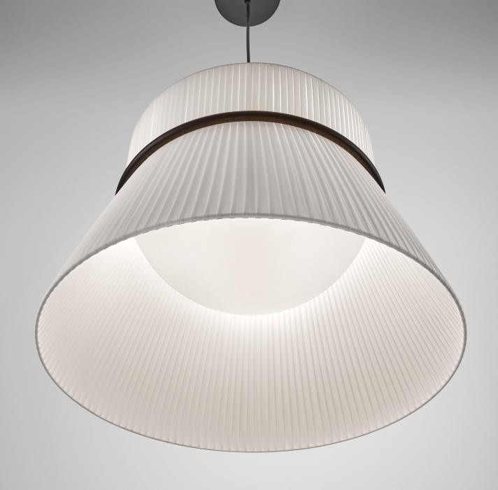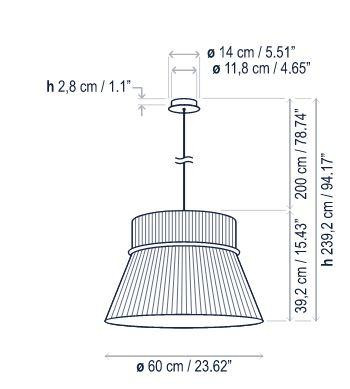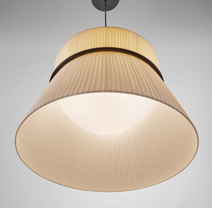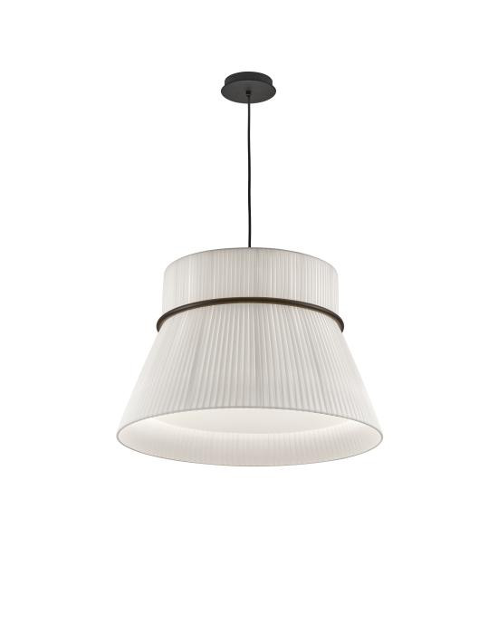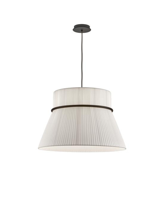 Die Bover Folie S/60 Pendelleuchte verfügt über einen Leuchtenschirm aus textilem Wickelplissee. Ihr Leuchtenschirm hat einen Durchmesser von 60 cm und eine Höhe von 39,2 cm. Ein Ring aus schwarzem Stahl umgibt als Designelement den Leuchtenschirm. Das Licht wird durch den Schirm zu den Seiten gefiltert abgegeben. Ein halbkugelförmiger Diffusor aus Polycarbonat sorgt dafür, dass das Licht auch blendfrei nach unten abgegeben wird. Das 200 cm lange Kabel der Pendelleuchte ist bei Bedarf kürzbar. Diese Pendelleuchte ist in den Schirmfarben weiß und creme erhältlich. Die Bover Folie S/60 verfügt über E27-Fassungen und kann mit austauschbaren LED-Retrofit Leuchtmitteln betrieben werden.