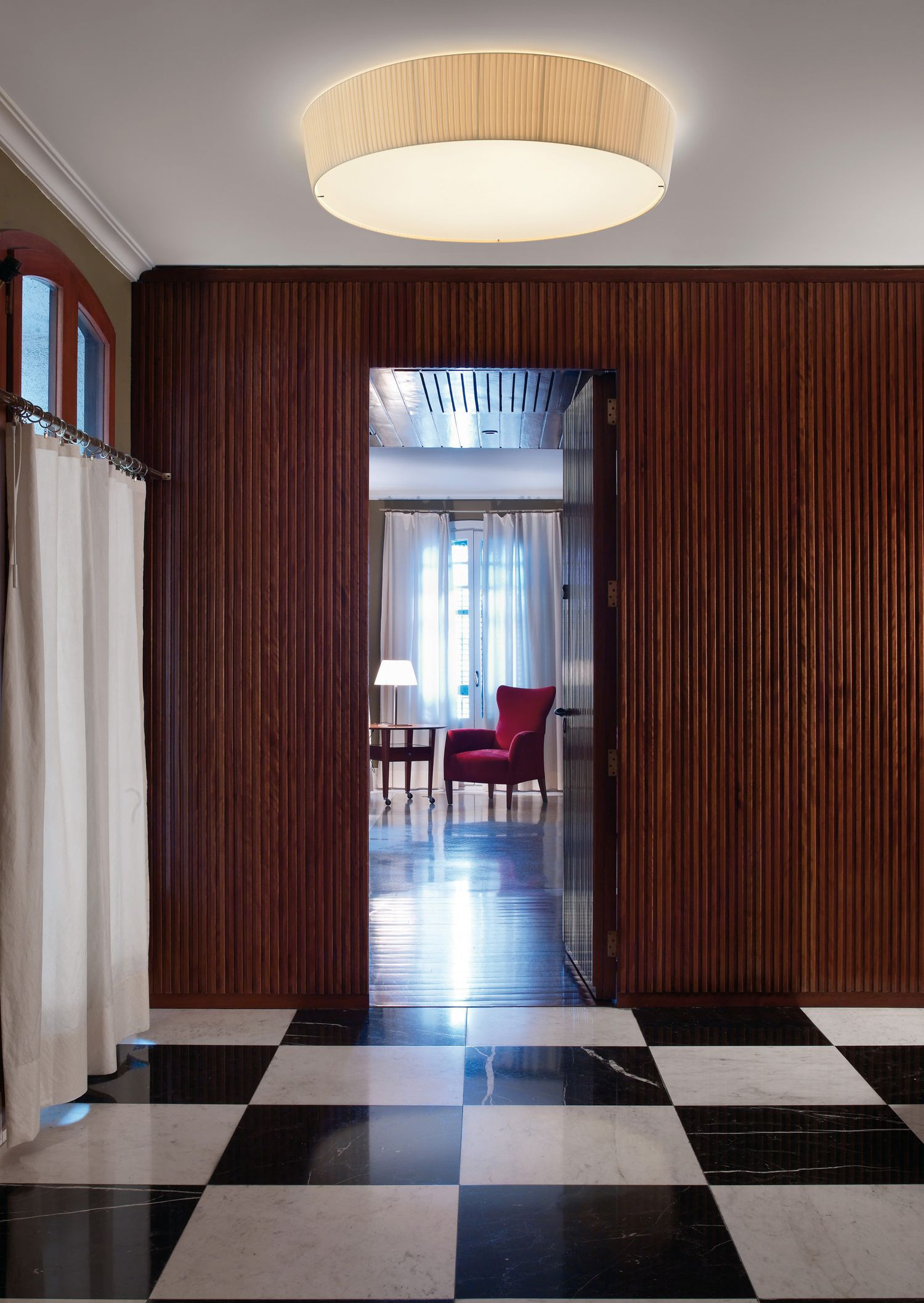 Die Bover Plafonet 95 ist eine runde Deckenleuchte mit einem Grundkörper aus stabilem Eisen. Der Körper wird von einem textilen Leuchtenschirm umgeben, der in aufwendiger Handarbeit hergestellt wird.