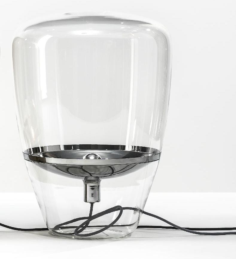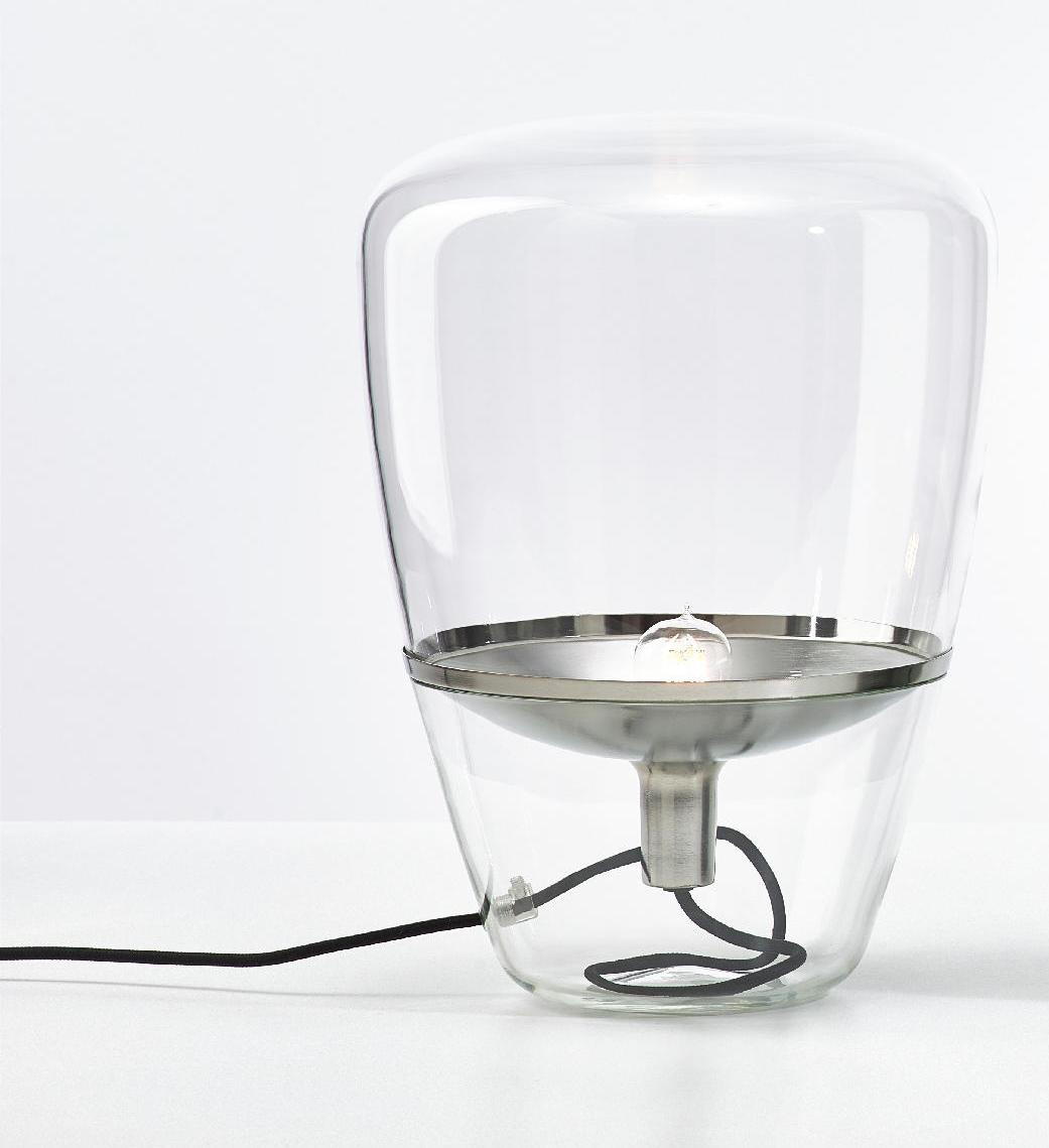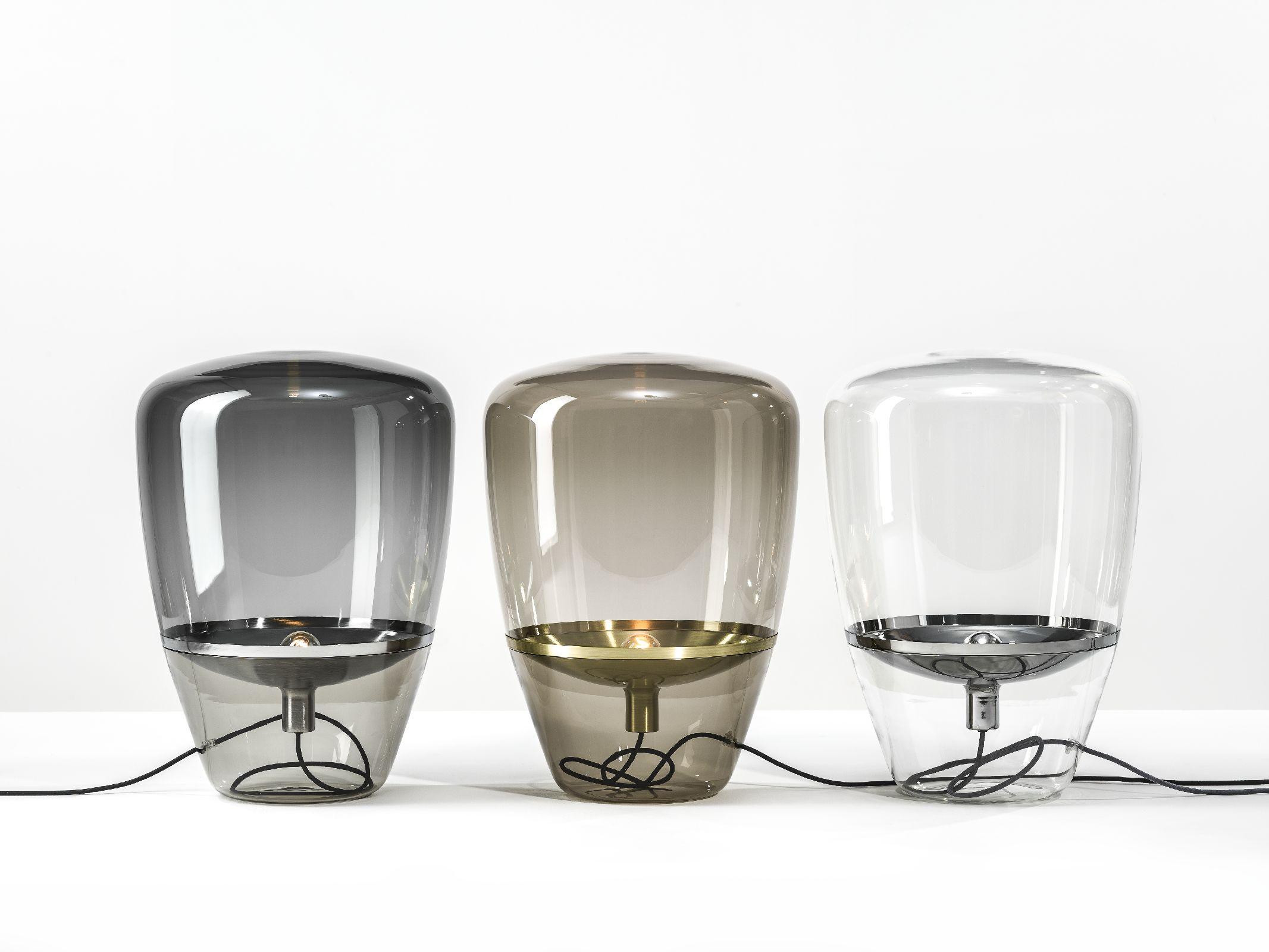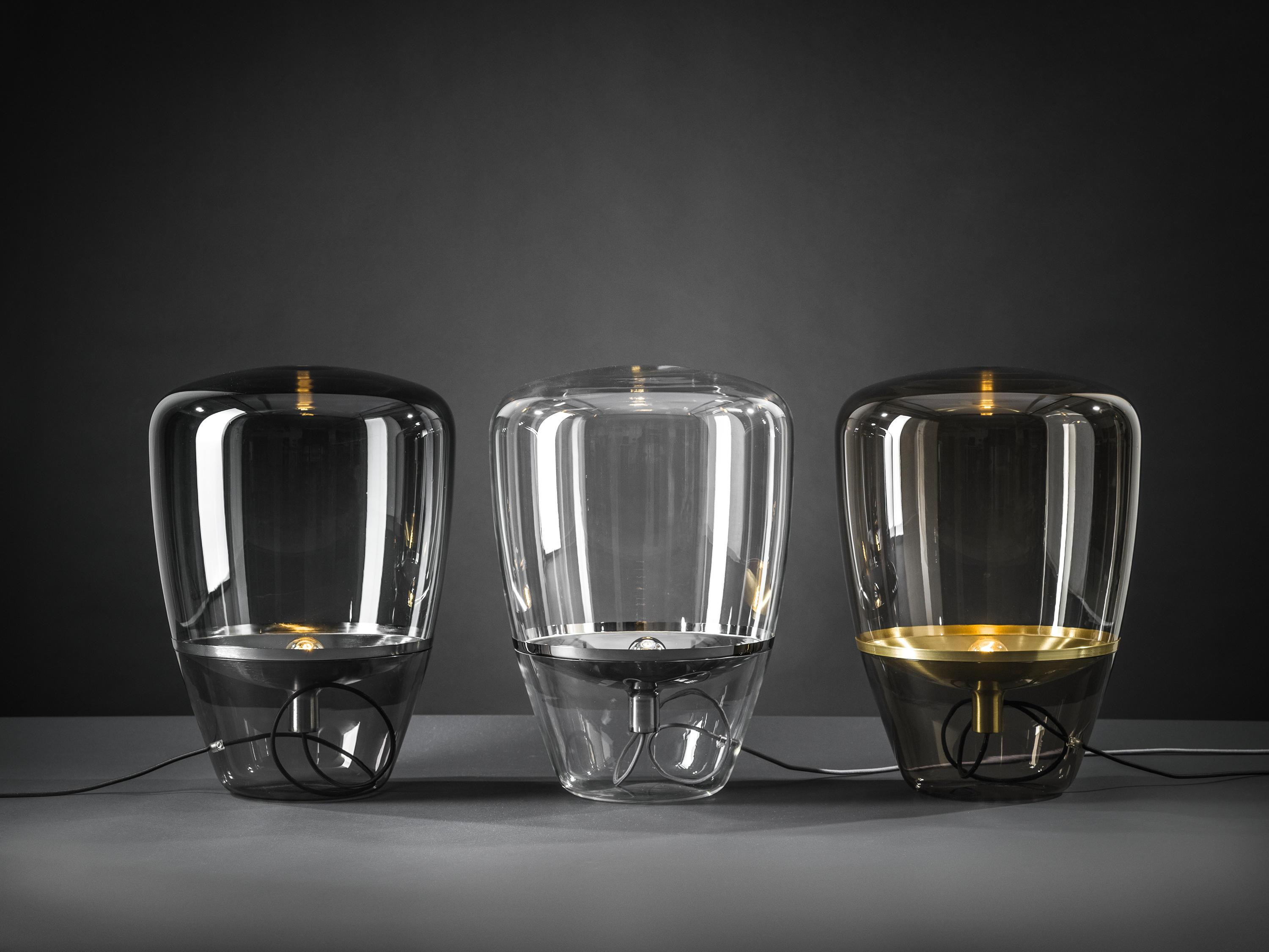 Diese Brokis Balloons Small Tischleuchte verfügt über ein transparentes, mundgeblasenes Glas. Die Leuchte wird auch mit einem rauchgrauen und einem rauchbraunen Glas angeboten. Dies ist die kleine Tischleuchte mit einer Höhe von 40 cm und einem Durchmesser von 28,5 cm. Sie wird außerdem in zwei weiteren Größen angeboten. Ihr Metallreflektor wird von Hand bearbeitet und in den Farben weiß, schwarz, zitronengelb, orange, Chrom, Messing, Kupfer und Chrom gebürstet angeboten. Je nach Wahl des Metallreflektors ist das Kabel weiß, schwarz, hellgrau oder dunkelgrau. Auf Anfrage werden alle Versionen auch mit einem Kabel in Schwarz, Weiß, Hellgrau, Dunkelgrau, Rot und Gelb angeboten. Auf dem Kabel ist ein Dimmer integriert. Die Balloons Small Tischleuchte von Brokis hat eine E14-Fassung, die mit Halogenlampen oder LEDs betrieben werden kann.