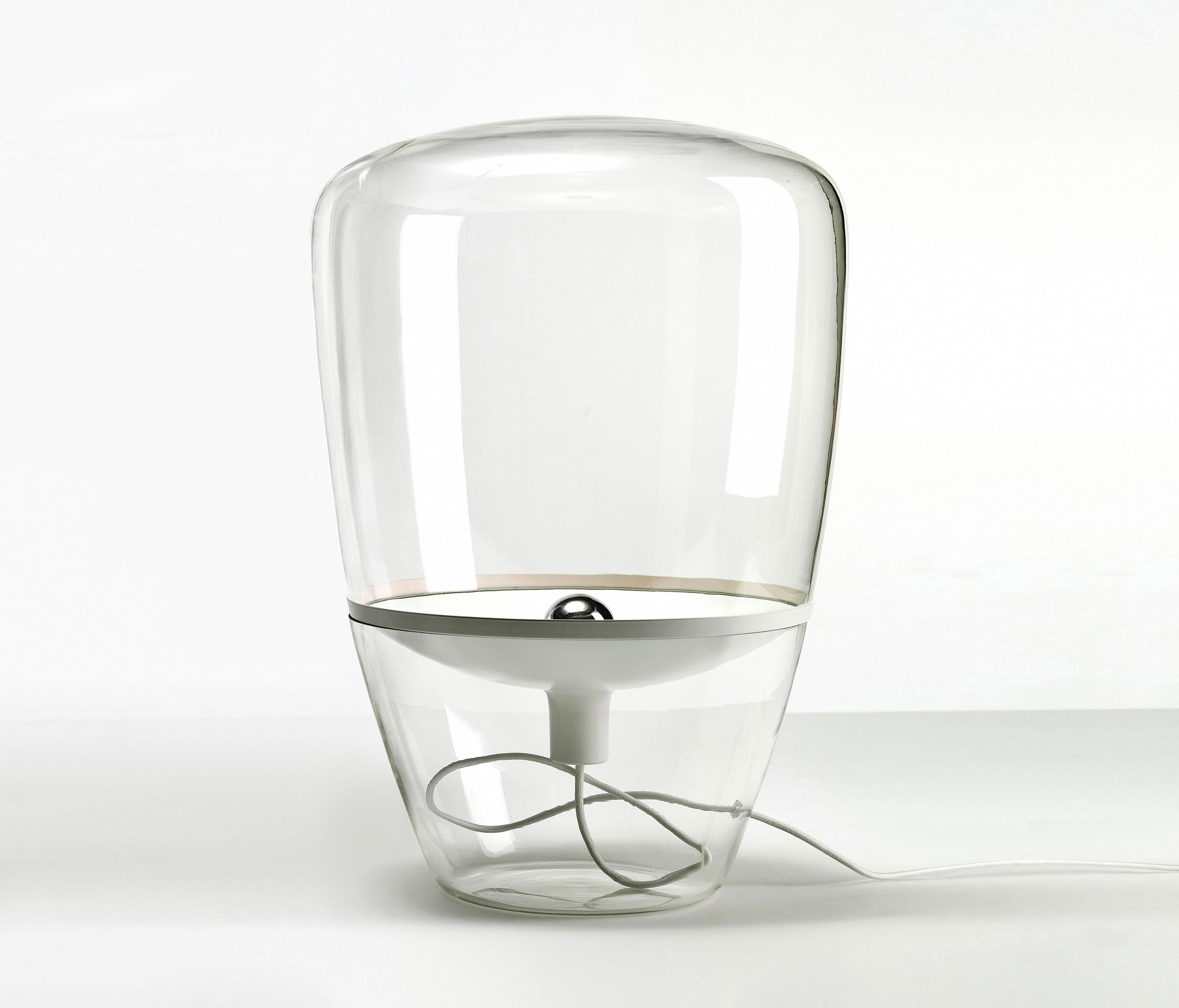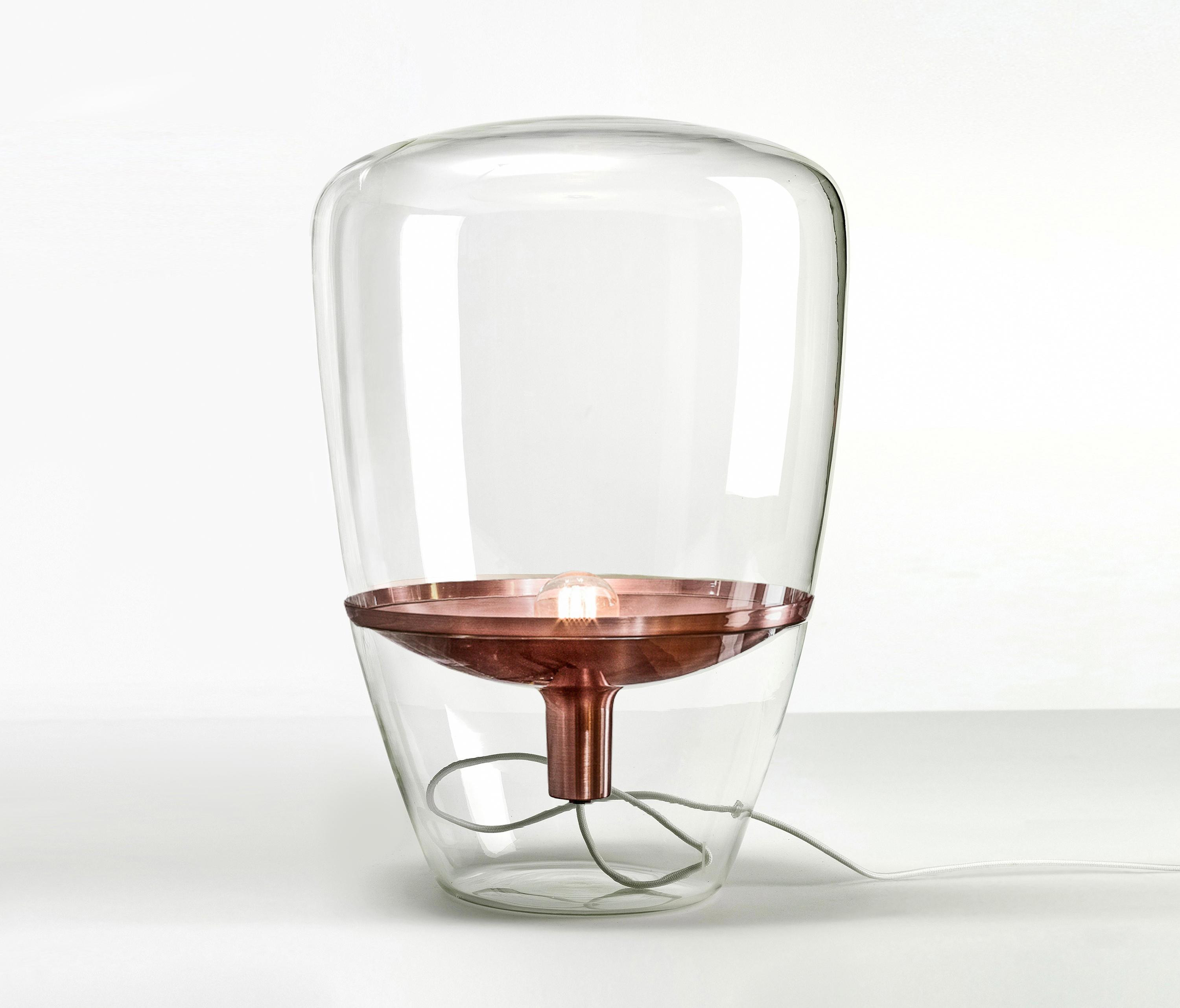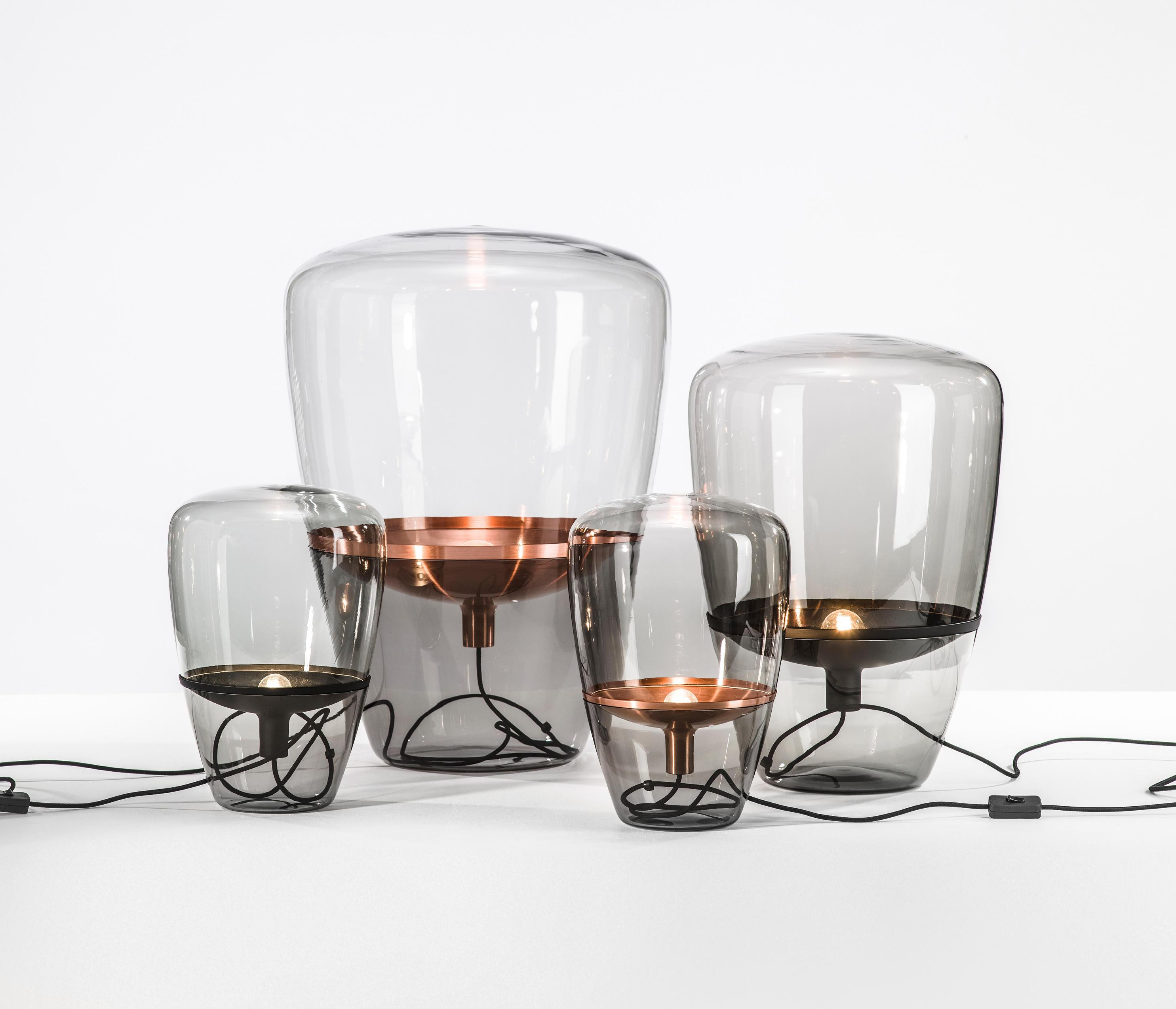 Diese Brokis Balloons Small Tischleuchte verfügt über ein transparentes, mundgeblasenes Glas. Die Leuchte wird auch mit einem rauchgrauen und einem rauchbraunen Glas angeboten. Dies ist die kleine Tischleuchte mit einer Höhe von 40 cm und einem Durchmesser von 28,5 cm. Sie wird außerdem in zwei weiteren Größen angeboten. Ihr Metallreflektor wird von Hand bearbeitet und in den Farben weiß, schwarz, zitronengelb, orange, Chrom, Messing, Kupfer und Chrom gebürstet angeboten. Je nach Wahl des Metallreflektors ist das Kabel weiß, schwarz, hellgrau oder dunkelgrau. Auf Anfrage werden alle Versionen auch mit einem Kabel in Schwarz, Weiß, Hellgrau, Dunkelgrau, Rot und Gelb angeboten. Auf dem Kabel ist ein Dimmer integriert. Die Balloons Small Tischleuchte von Brokis hat eine E14-Fassung, die mit Halogenlampen oder LEDs betrieben werden kann.