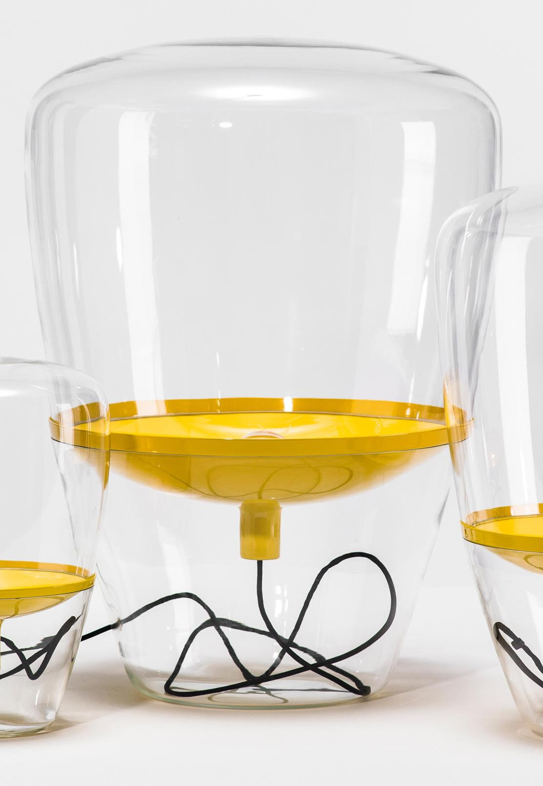 Diese Brokis Balloons Large hat ein transparentes, mundgeblasenes Glas. Sie wird außerdem mit einem rauchgrauen oder rauchbraunen Glas angeboten. Die Tischleuchte ist 78,5 cm hoch und hat einen Durchmesser von 55 cm. Sie ist eine der größten Leuchten dieser Serie und ist in zwei weiteren Größen erhältlich. Im Glas ist ein Metall-Reflektor integriert. Der Reflektor wird bei der Herstellung von Hand bearbeitet und ist in den Farben schwarz, weiß, orange, zitronengelb, Kupfer, Messing, Chrom und Chrom gebürstet erhältlich. Je nach Wahl des Reflektors hat die Leuchte ein schwarzes, weißes, dunkel- oder hellgraues Kabel. Auf Anfrage gibt es die Balloons Large transparent in allen Versionen auch in den Kabelfarben weiß, schwarz, hellgrau, dunkelgrau, rot und gelb. Die E27-Fassung der Tischleuchte kann mit Halogenlampen oder LEDs betrieben werden.
