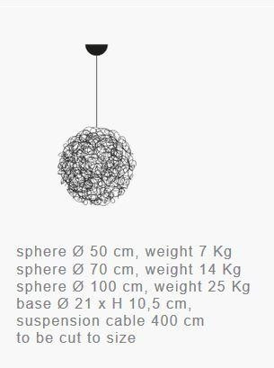 Die Catellani & Smith Fil de Fer IP65 Pendant ist eine Pendelleuchte, die für den Außenbereich geeignet ist. Sie verfügt über die Schutzklasse IP65, damit ist sie gegen Strahlwasser aus jedem beliebigen Winkel geschützt und außerdem staubdicht. Die Leuchte wird aus Aluminiumdraht hergestellt und verfügt über die Form einer Kugel. Sie wird in verschiedenen Größen angeboten: mit einem Durchmesser von 50 cm, 70 cm oder 100 cm. Je nach Durchmesser wird die Pendelleuchte mit acht, sechzehn oder 20 Niedervolt-LEDs betrieben. Die LEDs sind austauschbar. Der Baldachin hat einen Durchmesser von 21 cm sowie eine Höhe von 10,5 cm. Das Kabel der Pendelleuchte verfügt über eine maximale Länge von 400 cm und ist bei Bedarf kürzbar.
