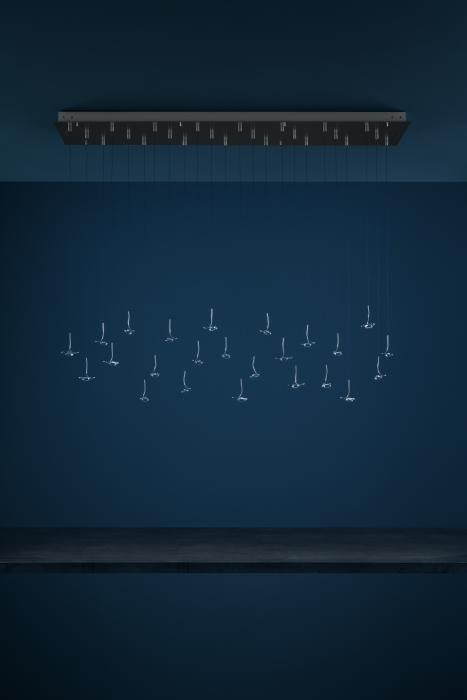 Die Catellani & Smith Jackie O Chandelier 15/20/24 ist ein Kronleuchter mit 15, 20 oder 24 Pendelleuchten. Es gibt diese Leuchte mit quadratischem oder rechteckigem Baldachin.