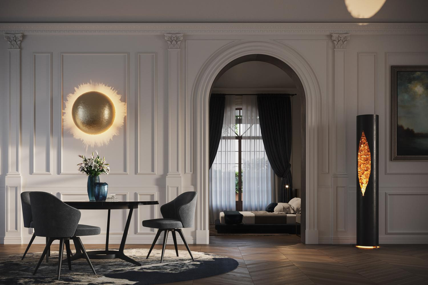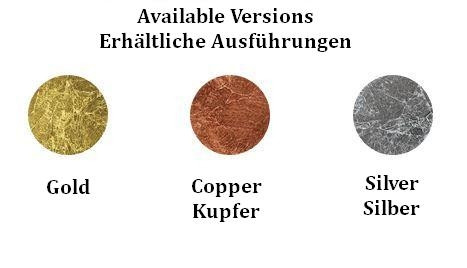 Die Colonna sieht von außen schwarz aus, von innen ist sie mit einer unregelmäßigen, reliefartigen Oberfläche bedeckt, die in den drei Versionen Blattgold, Kupfer und Blattsilber erhältlich ist. Eine austauschbare LED wird mitgeliefert und beleuchtet das Innere der Stehleuchte, so dass je nach Farbauswahl das reflektierte, austretende Licht einen anderen Schein wirft.