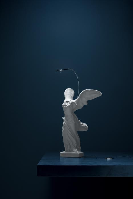 Die Catellani Smith Nike ist eine LED Leuchte mit einer weißen, kopflosen Engelsstatue.