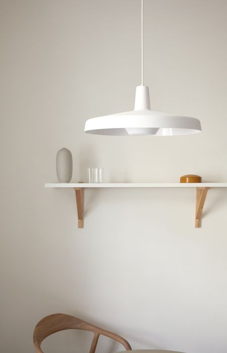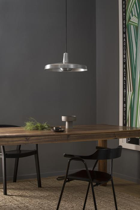 Die Grupa Arigato Pendant Large hat einen Durchmesser von 45 cm und eine Höhe von 18,6 cm. Der Leuchtenschirm dieser Pendelleuchte wird aus Aluminium hergestellt. Unten am Schirm ist ein Diffusor integriert, der dafür sorgt, dass das Licht blendfrei nach unten abgegeben wird. Der Baldachin der Leuchte besteht aus Stahl und hat einen Durchmesser von 8,6 cm. Das Kabel mit einer Länge von 250 cm kann bei Bedarf gekürzt werden. Auf Anfrage sind auch andere Kabellängen erhältlich. Die Arigato Pendelleuchte verfügt über eine E27-Fassung und kann mit Halogenlampen oder LED Retrofits betrieben werden. Die Leuchte ist in diesen Schirmfarben erhältlich: weiß oder schwarz matt gepulvert. Auf Anfrage wird die Pendelleuchte auch in anderen gepulverten Schirmfarben angeboten. Grupa bietet aus der Arigato Serie auch eine kleinere Pendelleuchte mit einem Durchmesser von 22,8 cm an.