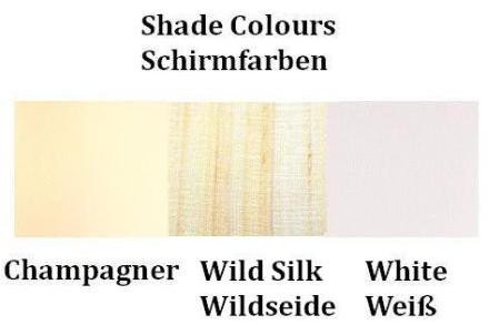 Der Holtkötter 2543 Ersatzschirm hat eine Höhe von 32,5 cm und einen Durchmesser von 55 cm an seiner breitesten Stelle. Er wird in den Farben champagner, Wildseide und weiß angeboten. Die beiden Versionen champagner und weiß sind aus hochwertigem Chintz. Dies ist ein Ersatzteil für die 2543 Stehleuchte von Holtkötter.