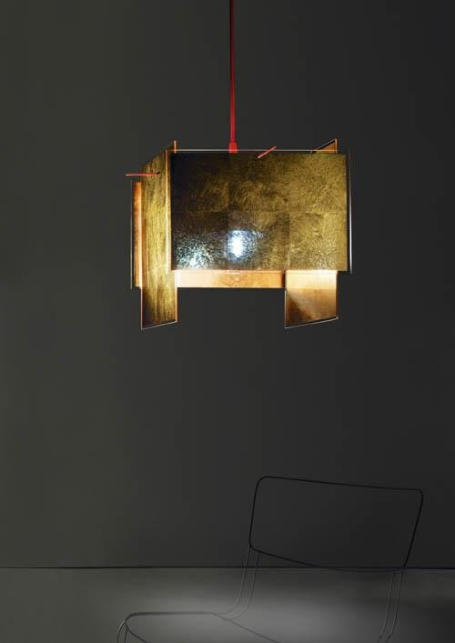 Die vier rechteckigen Scheiben der Ingo Maurer Pendelleuchte bestehen aus in Acrylglas eingegossenem Blattgold. Sie hängen im Inneren des Leuchten-Schirms an einem Drahtkreuz und können wahlweise waagrecht senkrecht oder schräg eingehängt werden. Die Innenseiten der 24 Karat Blau strahlen golden und die Außenseiten leuchten blau. Das rote Kabel dient neben der Stromversorgung auch als Aufhängung.