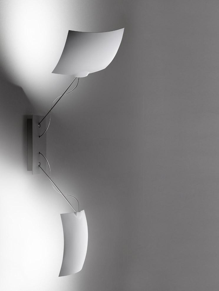 Die 2 x 18 x 18 hat je nach Einstellung der Schirme eine Ausladung zwischen ca. 40 und 80 cm. Die Wand- und Deckenleuchte ist bauseitig dimmbar. Sie ist eine Doppelversion der 18 x 18, die nur einen verstellbaren Schirm aufweist. Entworfen wurde sie 2016 von Ingo Maurer und seinem Team.