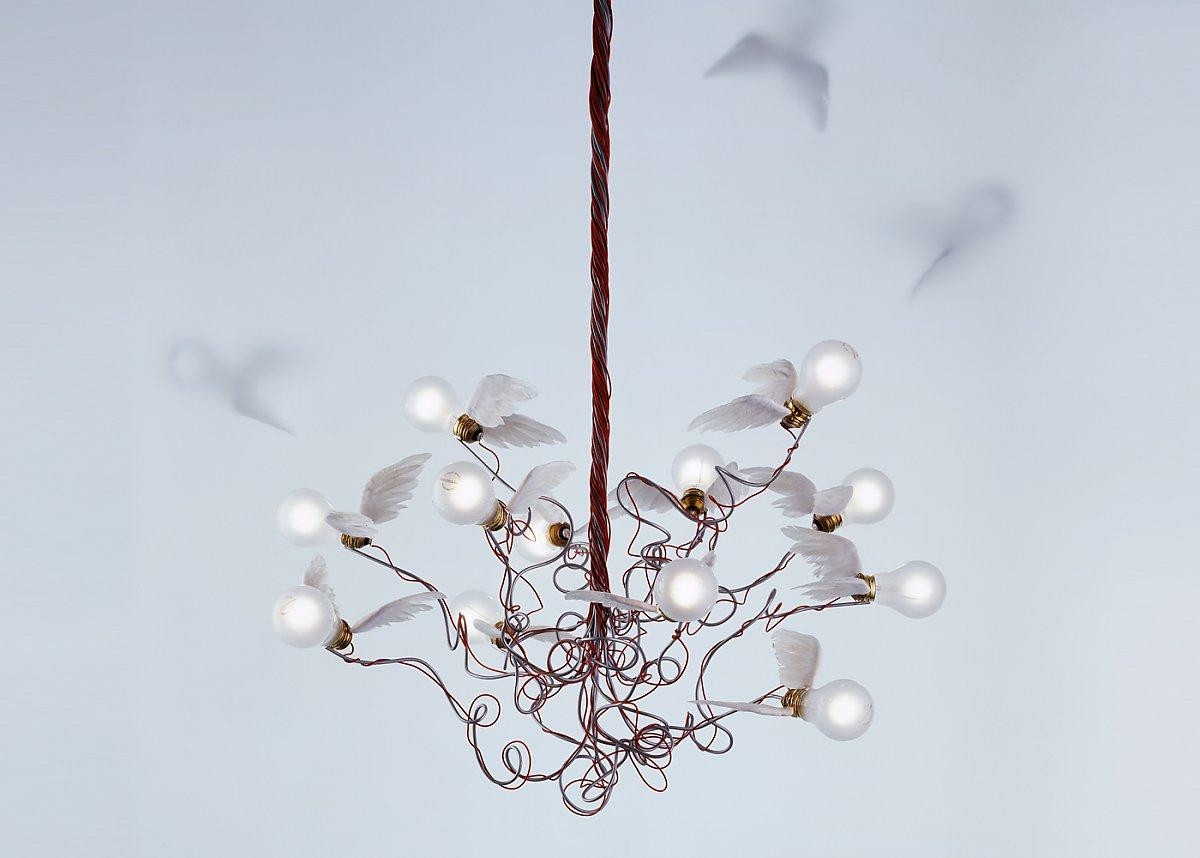 Die Ingo Maurer Birdie LED Pendelleuchte verfügt über zwölf biegbare und streckbare Leuchtenarme, die sich flexibel einstellen lassen. An jedem Arm ist ein LED Spezialleuchtmittel in klassischer Glühlampenform integriert. Jedes Leuchtmittel verfügt über eine Leistung von 1,5 Watt und eine Farbtemperatur von 2.700 Kelvin extra warmweiß. An den Fassungen der Leuchtmittel sind Gänsefedern angebracht, was der Leuchte ein außergewöhnliches Aussehen verleiht. Die Pendelleuchte wird mit einem roten oder transparenten Kabel angeboten. Im Baldachin ist ein Transformator integriert.