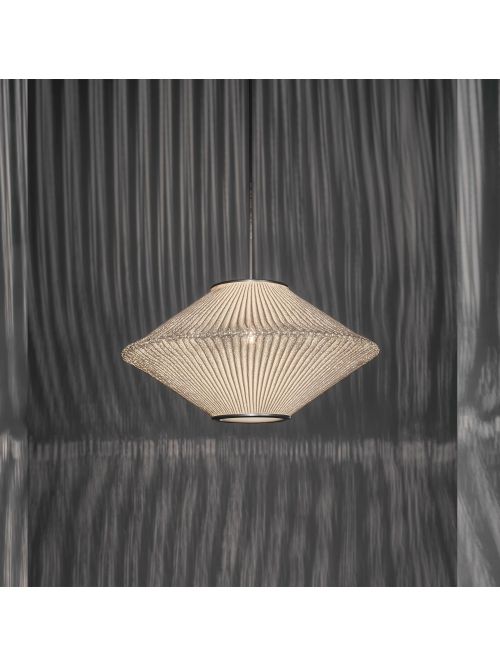 Die Pendelleuchte Ura1 UR104 zeichnet sich durch den Einsatz des extrem flexiblen Materials aus. Dieses Edelstahl-Metallgeflecht wurde exklusiv von der Marke Arturo Alvarez entwickelt und erlaubt dem Designer eine enorme kreative Freiheit. Die Pendelleuchte Ura1 UR104 wird in den Oberflächen weiß und grau angeboten. Auf Anfrage ist die Leuchte auch in taupe und beige erhältlich. Sie hat ein transparentes Kabel, auf Anfrage ist sie auch mit einem schwarzen Kabel erhältlich. Das Kabel dieser Pendelleuchte, die eine Gesamthöhe von 150 cm besitzt, kann bei Bedarf gekürzt werden. Die Ura1 UR104 hat einen Durchmesser von 50 cm und eine Höhe von 26 cm. Diese bauseitig dimmbare Pendelleuchte wird von einem Leuchtmittel mit E27 Fassung betrieben. Diese Leuchte kann mit LED-Retrofit Leuchtmitteln betrieben werden. Neben dieser E27-Leuchte ist auch eine Version der Pendelleuchte mit integrierter LED erhältlich.
