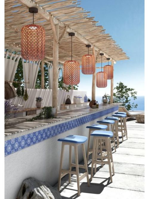Die Bover Nans S/31.2 Outdoor Pendelleuchte verfügt über einen Leuchtenschirm aus einer handgewebten, synthetischen Polyethylenfaser. Der Leuchtenschirm hat einen Durchmesser von 31,5 cm und ist 45,7 cm hoch. Die synthetische Polyethylenfaser ist so widerstandsfähig und wetterbeständig, dass diese Leuchte auch als Außenleuchte geeignet ist. Mit einer Schutzart von IP65 ist die Pendelleuchte staubdicht und gegen Strahlwasser aus beliebigem Winkel geschützt. Das Licht wird nach unten durch einen Diffusor aus Polycarbonat blendfrei abgegeben. Durch die Struktur des handgewebten Leuchtenschirms wird das Licht auch seitlich abgegeben.