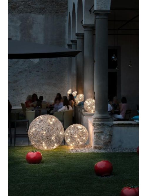Die Catellani & Smith Fil de Fer F IP65 Floor ist eine Stehleuchte für den Außenbereich. Diese Leuchte besteht aus einem Geflecht aus Aluminiumdraht in Form einer Kugel, mit vielen LEDs im Inneren. Sie wird mit einem Durchmesser von 50 cm (mit 8 LED Leuchtmittel à 1 Watt), 70 cm (mit 16 Leuchtmittel à 1 Watt) und 100 cm (mit 20 Leuchtmittel à 1 Watt) angeboten. Diese Außenleuchte verfügt über die Schutzklasse IP65.