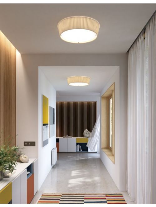 Die Plafonet 60 wird vom spanischen Hersteller Bover nach dem Design von Joana Bover gefertigt. Der Leuchtenkörper dieser runden Deckenleuchte ist aus stabilem Eisen gefertigt und besitzt einen Durchmesser von 60 cm. Der textile Leuchtenschirm, der diese Deckenleuchte umgibt, ist in Handarbeit hergestellt und 15 cm hoch. Der zylindrisch zulaufende Leuchtenschirm der Bover Plafonet 60 besitzt am unteren Teil der Leuchte einen Durchmesser von 54 cm. Durch den weißen Diffusor aus optischem Glas und den Leuchtenschirm wird das Licht nach unten und auch zu den Seiten abgegeben. Diese Deckenleuchte ist in den Schirmfarben weiß, creme und naturweiß erhältlich. Die Schirme in Weiß und Creme sind aus geripptem Wickelplissee, der naturweiße Schirm aus Baumwolle. Diese Deckenleuchte hat vier E27 Fassungen und wird mit austauschbaren LEDs (Retrofit) betrieben.