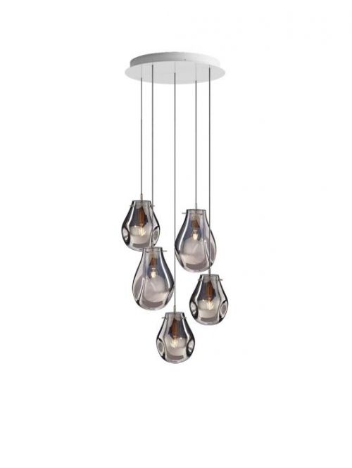 Dieser Bomma Soap Kronleuchter besteht aus zwei Soap Large und drei Small Pendelleuchten an einem runden Baldachin. Bei allen Leuchten ist die Glasfarbe die gleiche. Folgende Glasfarben werden angeboten: gold, silber, blau, matt und klar. Der weiß beschichtete Baldachin verfügt über einen Durchmesser von 56 cm und eine Höhe von 6,2 cm. Jedes Glas wird in Einzelanfertigung aus Kristallglas hergestellt und ist ein Unikat, da es ohne Form mundgeblasen wird. Dadurch können Form, Größe und Farbintensität variieren. Die Leuchten glitzern und schimmern vor allem im eingeschalteten Zustand. Jede Leuchte hat eine E27-Fassung, die mit einer LED Retrofit betrieben wird.