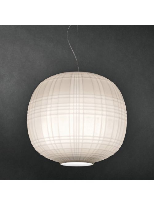 Die Foscarini Tartan ist eine fast kugelförmige Pendelleuchte aus weißem, geblasenem Glas. Die Leuchte verfügt über eine Reliefstruktur, die an die Karomuster schottischer Kilts erinnert, daher auch der Name. Beim Herstellungsprozess wird das Glas, um diesen Effekt zu erzeugen, in eine Form mit Einkerbungen geblasen. Zudem wird die Oberfläche mit Säure behandelt.