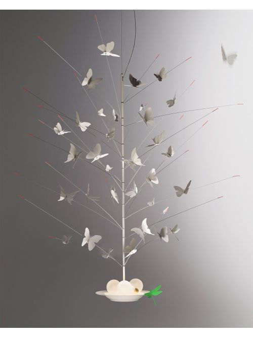 Die Ingo Maurer La Festa Delle Farfalle Pendelleuchte verfügt über 34 weiße Schmetterlinge, die auf unterschiedlichen Ebenen befestigt sind. Die Anordnung der einzelnen Schmetterlinge ist beliebig änderbar. Im unteren Teil der Leuchte sind drei LEDs in Glühlampenform integriert. Die LEDs geben ihr Licht sowohl blendfrei nach unten als auch nach oben auf die Schmetterlinge ab. Neben den 34 weißen Schmetterlingen gehört zur Leuchte auch eine grüne Libelle, die am unteren Teil der Pendelleuchte befestigt wird. Diese Leuchte verfügt über eine Höhe von 85 cm. Als Zubehör ist ein Set mit 34 schwarzen Schmetterlingen und einer roten Libelle erhältlich, die teilweise oder komplett anstelle der mitgelieferten Insektenfiguren an der Leuchte befestigt werden können. Die integrierten LEDs sind bauseitig dimmbar. Diese Pendelleuchte hat eine Kabellänge von 250 cm und ist höhenverstellbar.