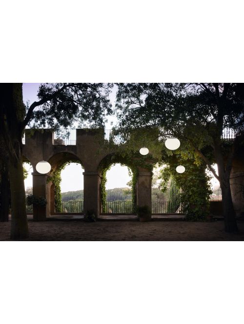 Die Elipse S/30/H Outdoor von Bover mit der Elipsenform des Leuchtenschirms stammt von den Designern Alex Fernández Camps und Gonzalo Mila. Diese Außenleuchte ist 25,9 cm hoch und hat einen Durchmesser von 30 cm. Die weiße Außenleuchte ist aus widerstandsfähigem Polyethylen gefertigt und an Metalloberflächen silber eloxiert. Das sehr harte und resistente Polyethylen, aus dem diese Leuchte gefertigt wird, ist perfekt geeignet für den Außen-Einsatz. Die Bover Elipse S/30/H Outdoor ist dank der Schutzklasse IP66 wetterbeständig und gegen UV-Strahlung geschützt. Mit ihrem schwarzen, 390 cm langen, wasserdichten Neoprenkabel ohne Schalter kann diese Lampe vorübergehend an vielen Plätzen aufgehängt werden. Diese Pendelleuchte mit E27 Fassung kann mit LED-Retrofit Leuchtmitteln betrieben werden. Gummiaufhängungen, die das temporäre Aufhängen an vielen verschiedenen Orten erleichtern, werden mitgeliefert.