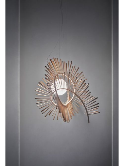 Die Arturo Alvarez Aimei Pendelleuchte wird aus Eschenholz hergestellt. Eschenholz ist ein besonders flexibles und vielseitig einsetzbares Material. Durch handwerkliche Prozesse können bei der Verwendung von diesem widerstandsfähigen und hochwertigen Material gebogene und langlebige Oberflächen gefertigt werden. Ein kugelförmiger Diffusor aus Glas entblendet das Licht und verteilt das abgegebene Licht gleichmäßig durch die Freiräume zwischen den Holzstäben im Raum. Die Leuchte ist insgesamt 80 cm hoch. Sie hat eine Länge sowie eine Breite von jeweils 80 cm. Die Pendelleuchte ist an einem transparenten Kabel befestigt. Der vernickelte Stahl-Baldachin hat einen Durchmesser von 12 cm. Inklusive der Aufhängung hat die Leuchte eine Gesamthöhe von 200 cm, das Kabel ist bei Bedarf kürzbar. Als Leuchtmittel ist in der Aimei eine LED mit einer Farbtemperatur von 2.700 Kelvin extra warmweiß integriert, die bauseitig dimmbar mit einem Phasenabschnittschnittdimmer ist. Die Pendelleuchte wird auf Anfrage auch mit einer Farbtemperatur von 3.000 Kelvin warmweiß angeboten. Außerdem gibt es auf Anfrage auch eine DALI dimmbare Version.