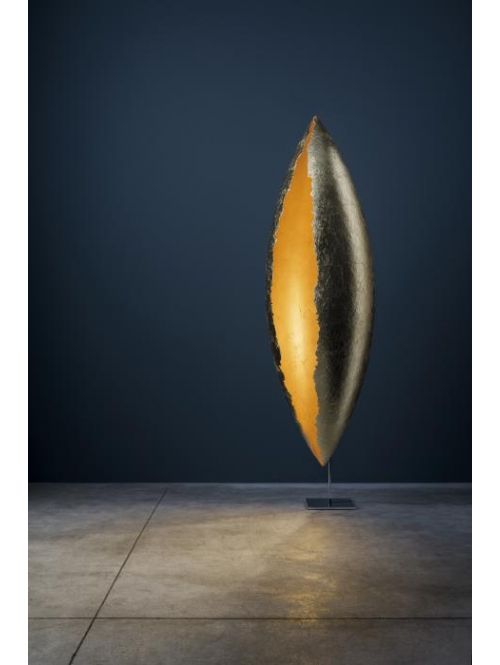 Die Catellani & Smith Post Krisi F 100 ist eine 185 cm hohe Stehleuchte. Der Schirm wird in den Oberflächen weiß, silber oder gold handbemalt. Der Leuchtenschirm ist aus Fiberglas und der Leuchtenstab aus vernickeltem Kupfer. In den Schirm sind acht LEDs eingebaut, jeweils mit einer Leistung von 1 Watt. Die LEDs haben eine Farbtemperatur von 2.700 Kelvin extra warmweiß und sind austauschbar. Ein Dimmer ist integriert.