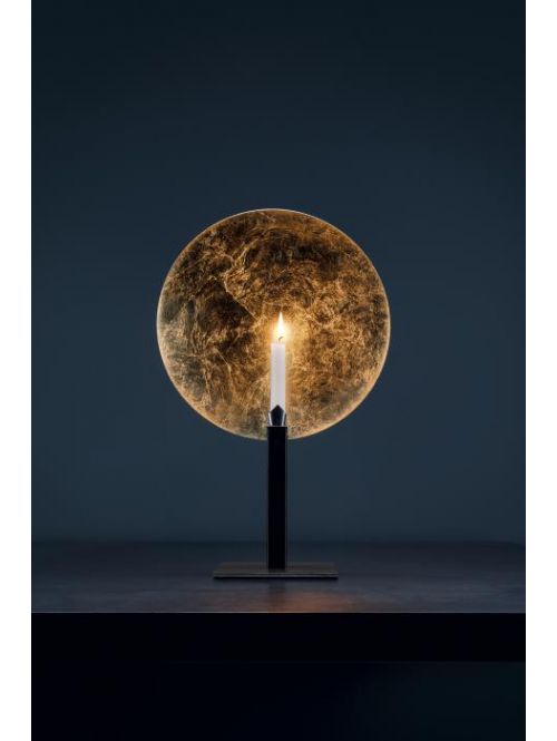 Die Kerze der Gemma Tavolo gibt ihr Licht auf einen Reflektorschirm in Form einer Scheibe ab. Dieser Reflektor verfügt über einen Durchmesser von 30 cm und steht auf einem Leuchtenfuß aus gewachstem Roheisen in Schwarz. Für die Reflektorscheibe werden drei Oberflächen angeboten: Blattgold, Kupfer und Blattsilber.