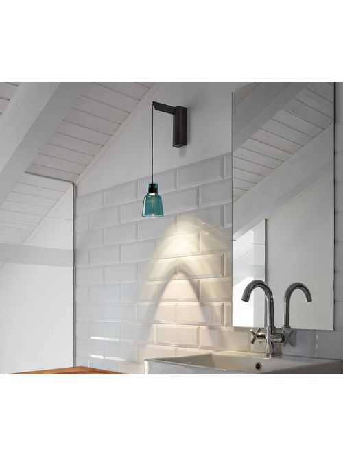 Die Bover Drip A/01 ist eine LED-Wandleuchte mit einer schwarzen Wandhalterung aus Metall. An einem schwarzen Koaxialkabel ist der kleine Leuchtenschirm aus Borosilikatglas befestigt. Das Glas der Bover Drip A/01 kann für den Austausch oder zur Reinigung entfernt/abgenommen werden. Die schwarze Wandhalterung ist 5 cm breit und 15 cm hoch. In einem Abstand von 18 cm von der Wand befindet sich die Kabelabhängung. Die Gesamthöhe der Leuchte beträgt 37,5 cm, der Ein-/Aus-Schalter befindet sich direkt auf der Wandhalterung. Die Höhe der Kabelabhängung kann nicht verstellt werden. Spezielle Kabellängen für die Bover Drip A/01 sind aber auf Anfrage erhältlich. Diese LED-Wandleuchte wird in den Farben transparent, mattweiß, grün, opal und blau angeboten.