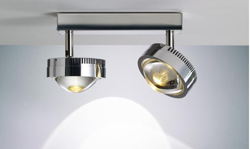 Der Licht im Raum Ocular Spot 2 Serie 100 verfügt über Dreh- und Kippgelenke, mit denen die Leuchtenköpfe beliebig gedreht werden können. Die Linsen in den Leuchtenköpfen verfügen über einen Durchmesser von 100 mm und sind schwenkbar. Der zweiflammige Deckenstrahler lässt sich auch als Wandstrahler einsetzen. Das Licht wird durch die Glaslinsen gebündelt und genau an die richtige Stelle gelenkt. Dies ist der größere und lichtstärkere Strahler von zwei Leuchten dieser Kollektion.