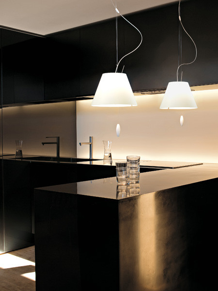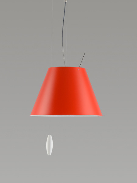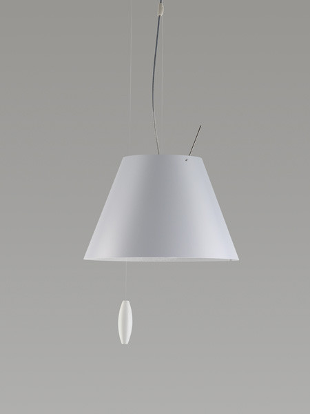 Die Luceplan Costanzina Pendelleuchte wird angeboten in insgesamt elf verschiedenen Schirmfarben. Mit einem Stäbchen-Schalter an der Fassung wird die Leuchte eingeschaltet. Das Gegengewicht ermöglicht die Höhenverstellung der Costanzina Suspension individuell von 100 cm bis 250 cm. Paolo Rizzatto entwarf diese Pendellampe 1992.