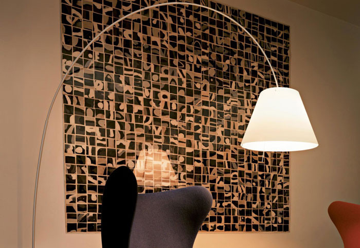 Der Sensordimmer verfügt über eine Stabform und befindet sich am Leuchtenkopf. Der Dimmer muss nur leicht berühren werden, um zwischen den drei Helligkeitsstufen zu wählen. Das Gestell ist immer aus Aluminium, während der Schirm in Weiß, Schwarz, Nougat oder Rot angeboten wird. Paolo Rizzatto entwarf die Leuchten dieser Serie 2008 nach dem Vorbild der bekannten Costanza Reihe.