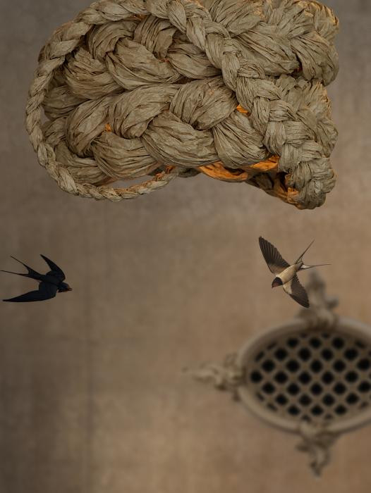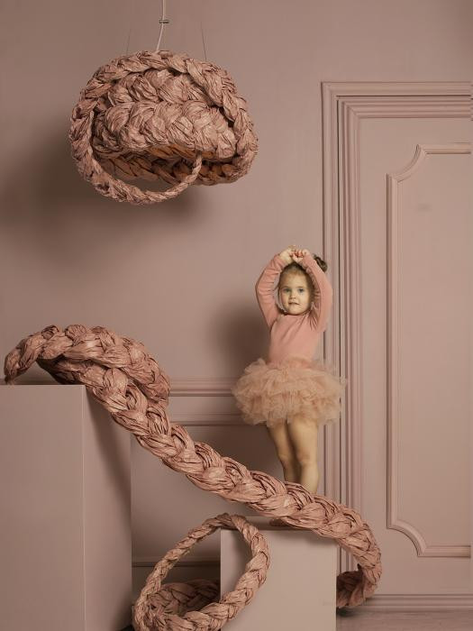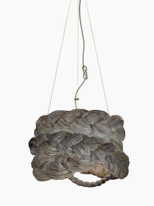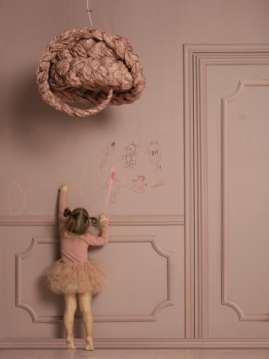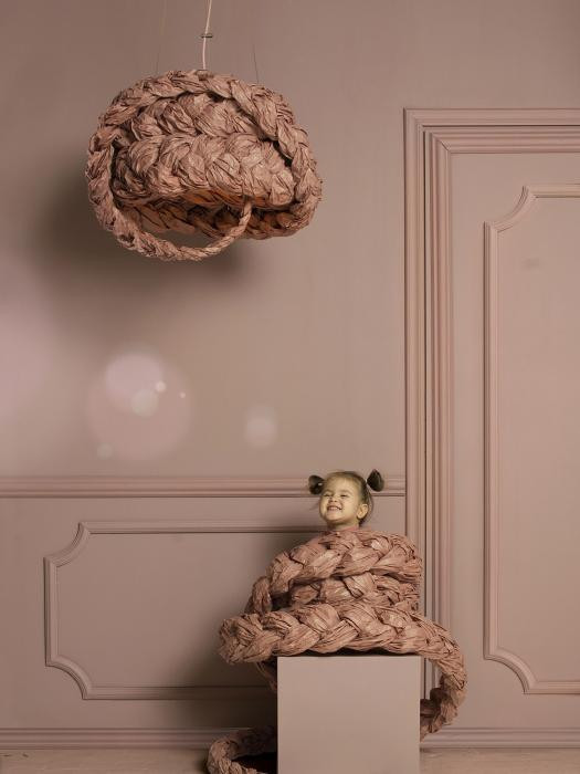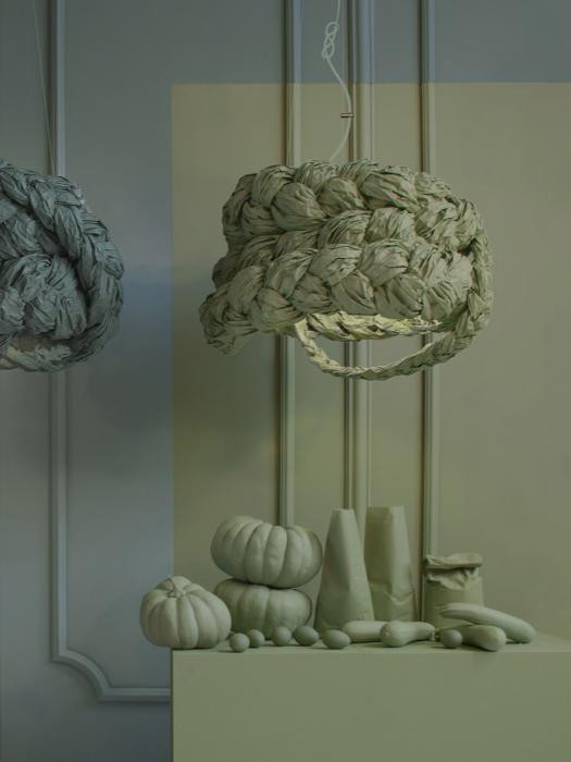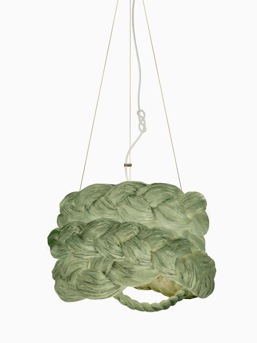 Die Mammalampa The Bride Pendant Lamp wird von Hand gefertigt und besitzt einen geflochtenen Leuchtenschirm aus Papier. Die Pendelleuchte wird mit einem Durchmesser von 60 cm oder 80 cm angeboten. Ihr Leuchtenschirm ist in sechs Farben erhältlich.