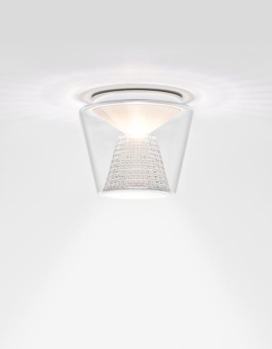 Diese Serien Lighting Annex LED Deckenleuchte hat einen klaren, mundgeblasenen Glasschirm und einen Reflektor aus Kristallglas. Das Licht wird direkt nach unten und durch den Reflektor nach oben und zur Seite abgegeben. Durch den Reflektor innerhalb des klaren Schirms entsteht ein dekorativer Lichteffekt an der Decke rund um die Leuchte.