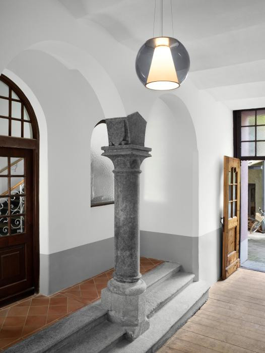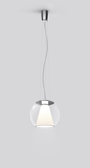 Die Serien Lighting Draft Suspension Rope S besitzt ein mundgeblasenes, transparentes Glas mit einem konischen Reflektor aus opalem Acrylglas. Die Pendelleuchte ist in den Glasfarben klar, braun und blau erhältlich. Der Reflektor richtet das abgegebene Licht direkt nach unten und streut es rundum weich und gleichmäßig.