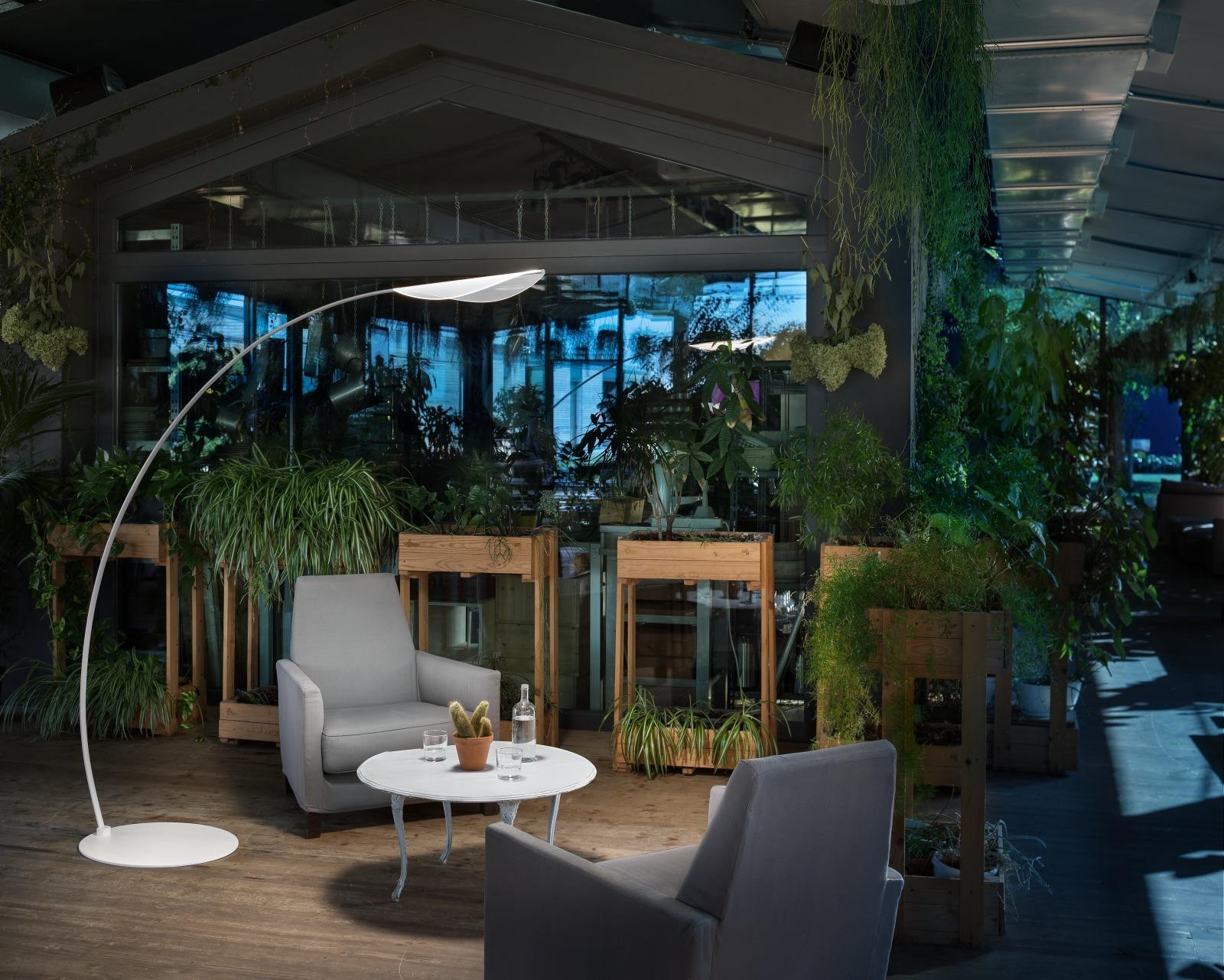 Die Stilnovo Diphy FL Bogenleuchte gibt Licht nach oben und unten ab. Ihr Diffusor wird im ausgeschalteten Zustand transparent, im eingeschalteten Zustand erscheint ein Punktmuster auf dem Diffusor.