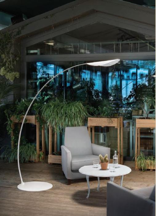 Die Stilnovo Diphy FL Stehleuchte verfügt über einen Diffusor an einem gebogenen Leuchtenstab und gibt ihr Licht sowohl nach unten als auch nach oben ab. Der Diffusor der Bogenleuchte wirkt im ausgeschalteten Zustand transparent, im eingeschalteten Zustand wird ein Punktmuster auf dem Diffusor sichtbar. Dieses Punktmuster wird bei der Herstellung mit der OptiLight Technologie per Laser eingraviert und ist der asiatischen Blume Diphylleya Grayi nachempfunden, von der die Diphy Leuchtenserie ihren Namen erhielt. Die Stehleuchte kann über einen Tastdimmer auf der Zuleitung reguliert werden. Durch Memory Funktion wird die zuletzt eingestellte Helligkeitsstufe gespeichert und beim nächsten Einschalten automatisch wieder ausgewählt.