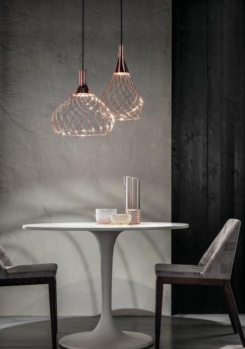 Die Stilnovo Mongolfier P1 ist eine organische Struktur, die sich in sich selbst verdreht, bis sie die Kontur einer sich verjüngenden Kreisform annimmt. Sie ist in schwarz lackiertem Metall, in Roségold oder schwarzem Nickel erhältlich. Pendellampe zur Beleuchtung eines Esstischs oder Wohnzimmers. Ihr Vintage-Charakter schafft auch in einem Restaurant oder Bistro die richtige Atmosphäre.