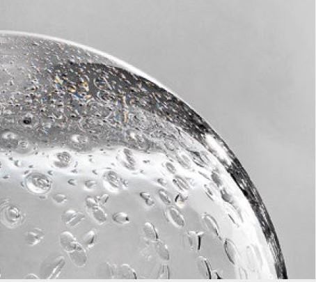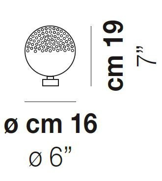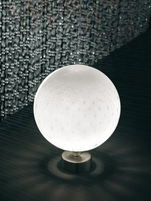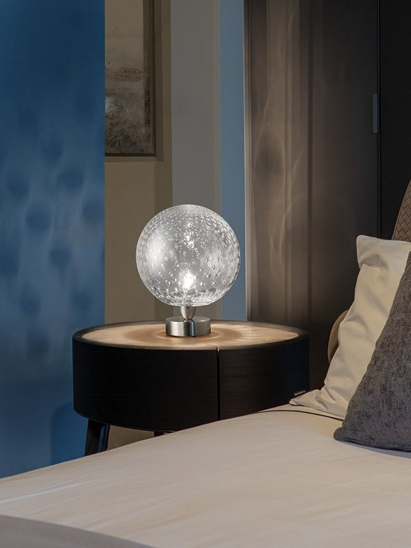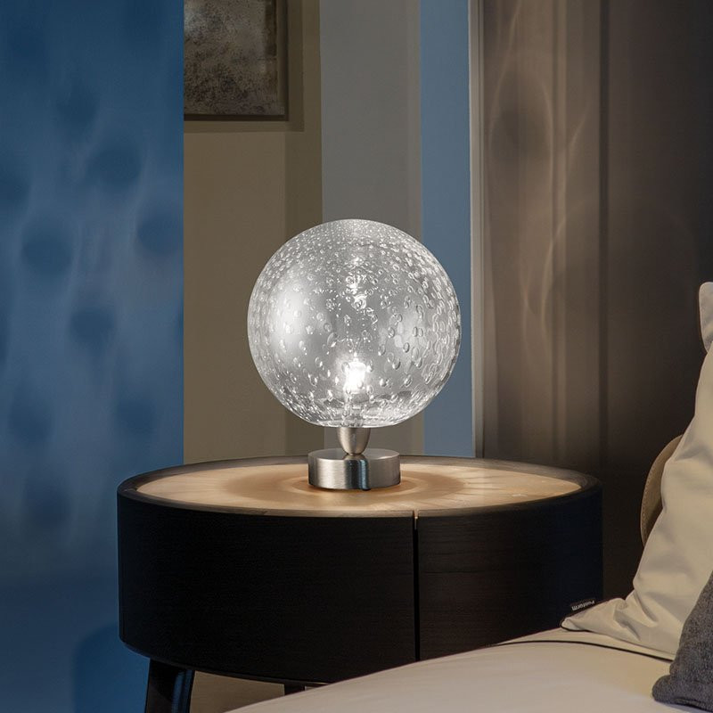 Die Vistosi Bolle LT P ist eine Tischleuchte mit einem Leuchtenschirm aus mundgeblasenem Kristallglas. Bei der Verarbeitung des Glases wird die Balaton-Technik angewandt, bei der Luftblasen im Glas eingeschlossen werden. Dies erzeugt eine besondere Textur, durch die die Reflexionen auf der Oberfläche des Glases vervielfacht werden. Außerdem erscheint ein Halo-Lichteffekt auf dem Tisch, auf dem die Leuchte steht. Der Leuchtenschirm wird in den Oberflächen Kristall transparent und weiß angeboten. Der Leuchtenfuß ist aus satiniert vernickeltem Metall gefertigt. Insgesamt ist die Bolle LT P 19 cm hoch und hat einen Leuchtenschirm mit einem Durchmesser von 16 cm. Auf der Zuleitung ist ein Ein-/Aus-Schalter integriert. Die Tischleuchte kann mit Halogenlampen oder LED Retrofits betrieben werden.